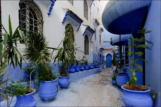 Το όνομα Chefchaouen προέρχεται από το »chauen», που είναι η ισπανική λέξη για τα κέρατα και αναφέρεται στο σχήμα των δύο βουνών γύρω από τον οικισμό. Σύμφωνα με τη βίβλο, οι Ισραηλίτες είχαν εντολή να βάψουν μπλε χρώμα τους χώρους στους οποίους προσεύχονταν, χρησιμοποιώντας μια παλιά φυσική χρωστική ουσία, η οποία προέκυπτε κατόπιν επεξεργασίας από ένα είδος οστρακοειδών. Όταν οι προσκυνητές θα κοίταζαν το μπλε χρώμα θα σκέφτονταν τον ουρανό, το Θεό και τον παράδεισο!Παρόλο που ο εβραϊκός πληθυσμός της Chefchoauen δεν είναι τόσο μεγάλος όσο ήταν παλιά , σχεδόν όλοι στην πόλη ακολουθούν ακόμα αυτό το παλιό έθιμο και συχνά ανανεώνουν το χρώμα στα σπίτια τους.